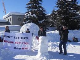 Στο Νταβός αναμένεται να παρευρεθούν συνολικά περίπου 3.000 εκπρόσωποι περισσότερων από 100 χωρών του κόσμου καθ'όλη την διάρκεια των εργασιών του Φόρουμ. Ωστόσο, μέλη του κινήματος «Καταλάβετε το Παγκόσμιο Οικονομικό Φόρουμ» έκαναν για πρώτη φορά στην ιστορία του Davos το αδιανόητο: κατασκεύασαν ένα μικρό χωριό από "ιγκλού" για να φιλοξενήσουν τις κινητοποιήσεις τους - δεδομένου ότι η θερμοκρασία φτάνει μόλις τους -5 βαθμούς Κελσίου την ημέρα, ενώ τη νύχτα πέφτει στους -12. Σε καθένα από τα 25 ιγκλού που χτίστηκαν από τα ίδια τα μέλη του κινήματος, θα μπορούν να φιλοξενηθούν δύο τουλάχιστον άτομα. Παράλληλα, δίπλα στα σπίτια από πάγο,εγκαταστάθηκαν δύο θερμαινόμενες σκηνές και κατασκευάστηκε ένα μαγειρείο.